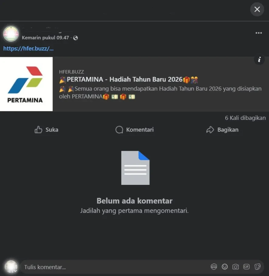 Setelah dilakukan penelusuran dan verifikasi mendalam, klaim mengenai Pertamina yang membagikan tautan hadiah Tahun Baru 2026 dipastikan SALAH atau hoaks. Pertamina selaku perusahaan energi nasional tidak pernah merilis program pembagian hadiah dengan skema semacam ini melalui pesan berantai atau tautan tidak resmi yang tersebar di luar kanal resmi perusahaan.