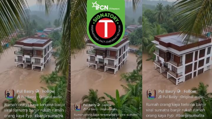 Beredar sebuah informasi di media sosial yang mengklaim sebuah video memperlihatkan rumah tiga lantai hanyut dalam kondisi utuh di Aceh. Video yang beredar ini sontak menimbulkan kehebohan dan beragam persepsi di kalangan warganet mengenai kebenaran peristiwa tersebut. Dalam salah satu unggahan yang dibagikan, narasinya menyebutkan “VIRAL LAGI KISAH RUMAH 3 LANTAI HANYUT DALAM KONDISI UTUH DI ACEH.” Narasi ini disertai dengan cuplikan video yang menampilkan sebuah bangunan yang tampak seperti rumah tiga lantai terlihat terombang-ambing di tengah arus air yang deras.